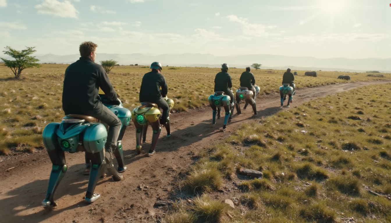 スムーズな金属質ボディとロボット馬の脚を持つKawasaki Corleoに乗ったライダーたちが、広大なサバンナを左から右へと移動中。バイクの色調は鮮やかだが調和の取れた深緑、ゴールドブロンズ、グラファイトシルバー。金色の日差しが長く伸びた影を落とし、遠くに野生動物が見える。グループの後ろには広い砂塵の軌跡が舞い、映画的で温かくリアリスティックな雰囲気。FLUXグループアドベンチャーのムード。サイドビュー