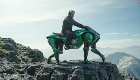 ロボット馬のような脚を持つKawasaki Corleoに乗り、霧の立つジャングルの道を左から右へ進む未来のライダーたち。バイクの色調は調和の取れたエメラルドグリーン、クロムシルバー、グラファイトブラックで、青緑の発光エネルギーコアを備える。高い木々の間から差し込む日差しが斑模様をつくり、柔らかな森の地面が足元で揺れる。映画的で光と雰囲気の美しさ。フォトリアリスティックなFLUXスタイル。サイドビュー