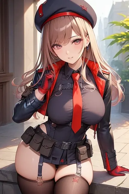 触发词:rapi_a,长发,棕色头发,刘海,红眼睛,大乳房,珠宝,耳环,帽子,黑色头饰,贝雷帽,领带,夹克,短款夹克,黑色夹克,长袖,敞开的衣物,敞开的夹克,紧身衣,黑色紧身衣,大腿,过膝袜,黑色过膝袜,手套,黑色手套,红色手套,腰带,包,肩带,