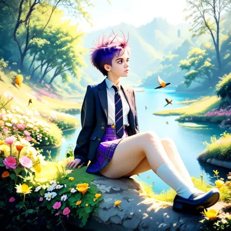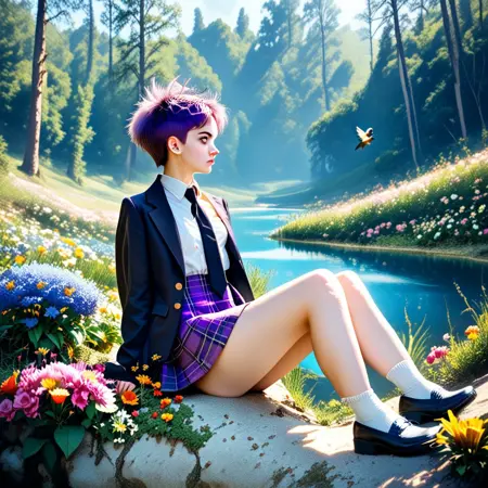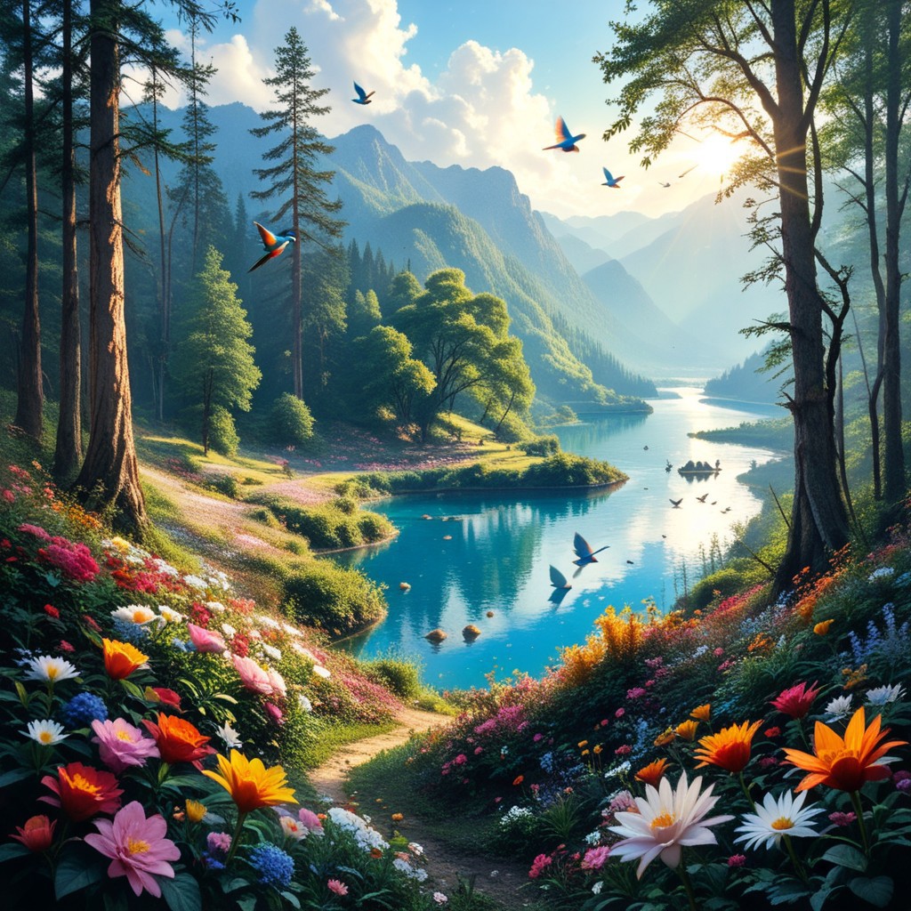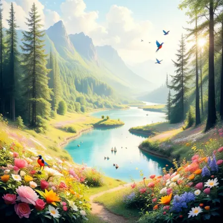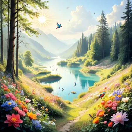 forest, blue sky, lake, flowers, birds, sunshine