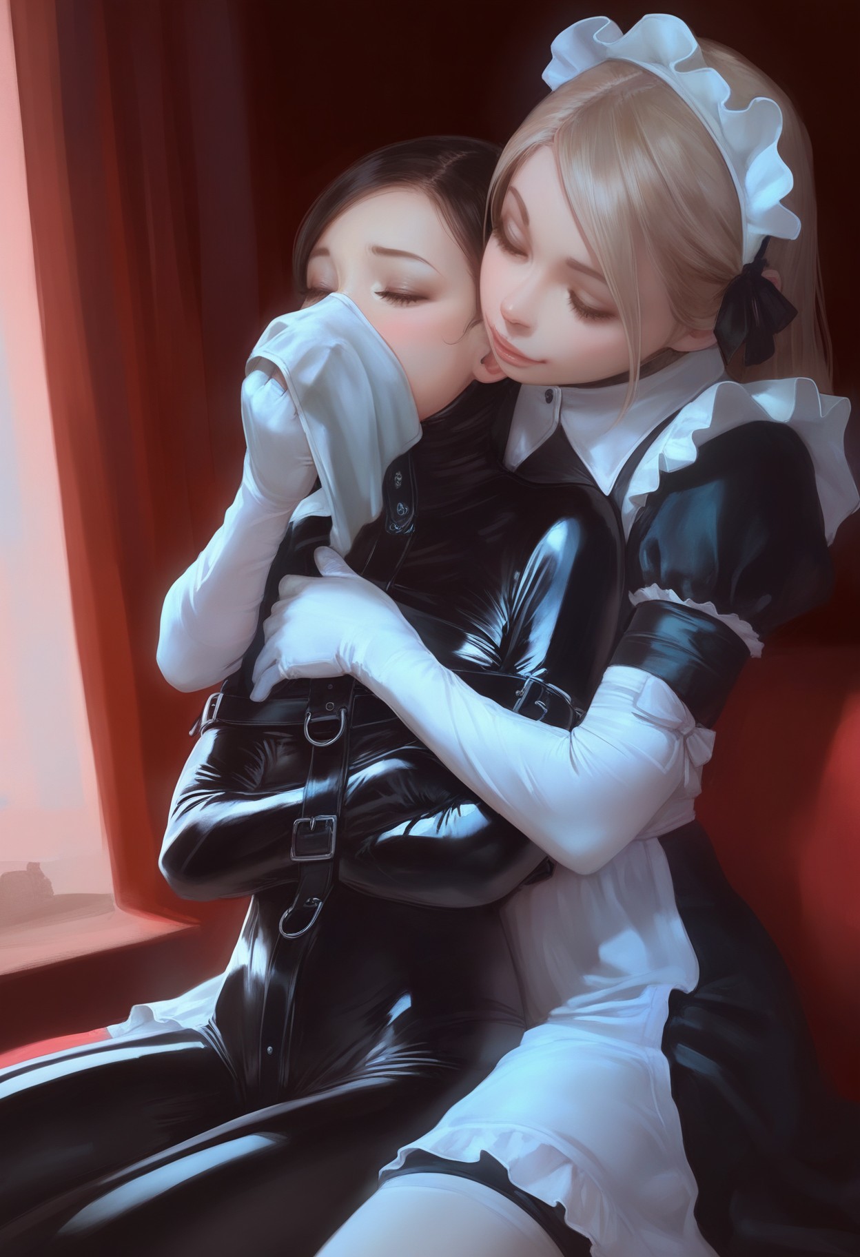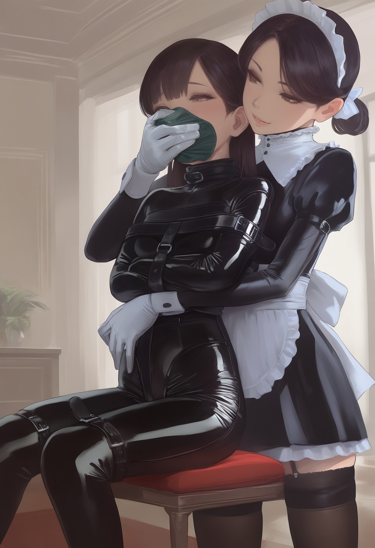 개념: bdsm, bound, bondage, yuri, femdom, saliva, drooling, gagged, frogtie, hogtie