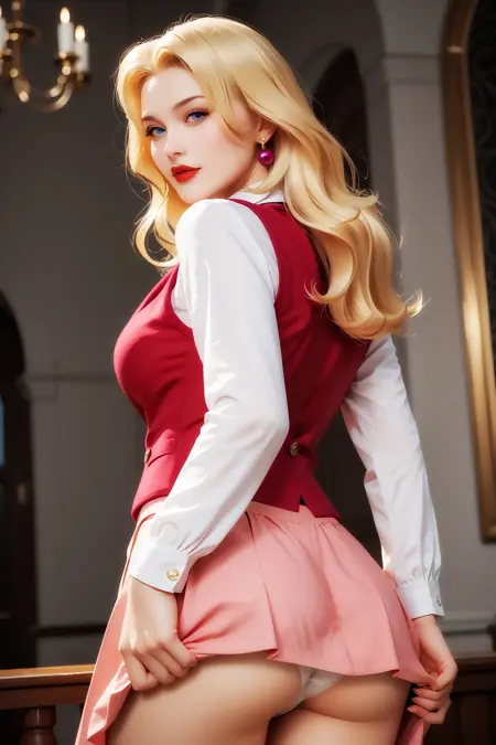 衣装のプロンプト:パープルのイヤリング, パープルのベスト, ポロシャツ, ピンクのスカート, ゴールドのフラットネックレス, 長い袖, ボタン