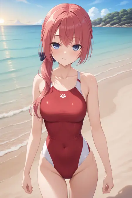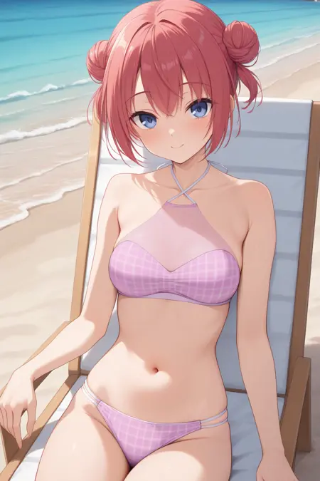 ddfumika, blue eyes, red hair, double bun, swimsuit, plaid bikini, pink bikini, criss-cross halter,