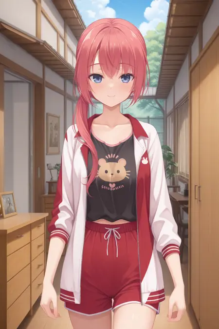 ccfumika, blue eyes, red hair, side ponytail, two-tone jacket, red jacket, open jacket, black shirt, animal print, red shorts,