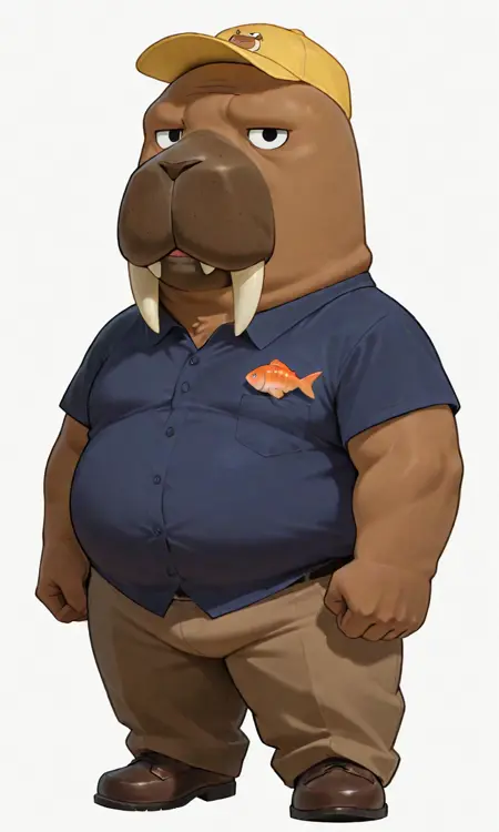 Odokawa, 人形海象,粗壮体型,长牙外露,棕色皮肤,深棕色吻部,宽颌,黑眼,圆润