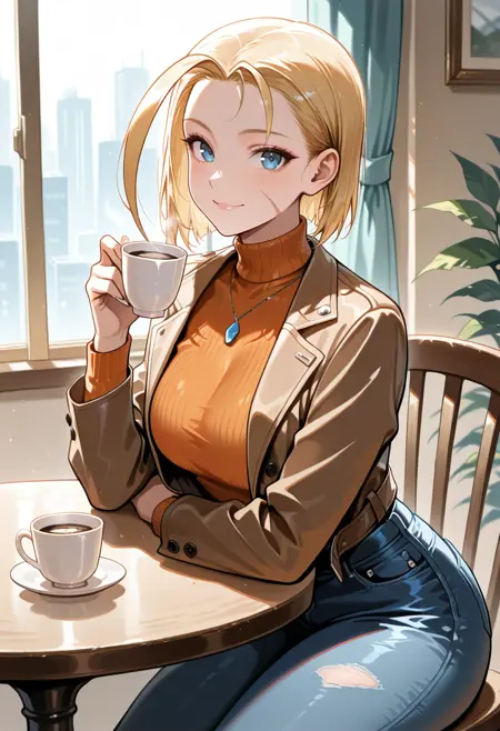 "CAMMS6, 短发, 金发, 脸上有疤痕, 巨大天线发, 蓝眼睛, 项圈, 短款夹克, 黑色运动文胸, 露腹, 黑色瑜伽裤, 不对称手套, 无指手套"