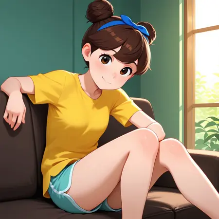 remy_rb, brown hair, brown eyes, double bun, yellow shirt, shorts