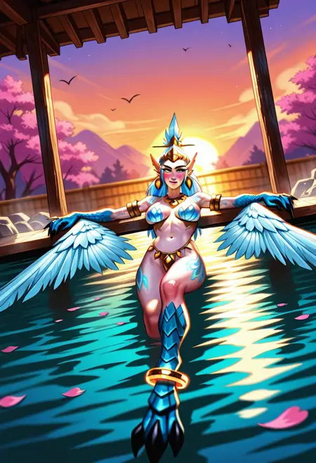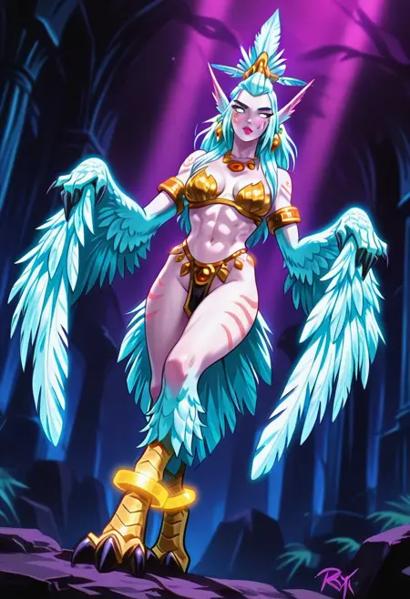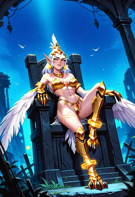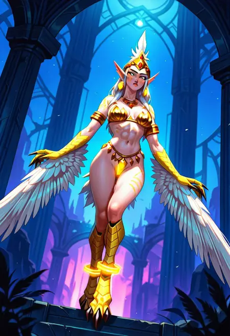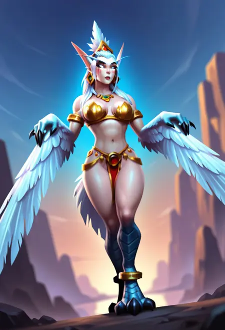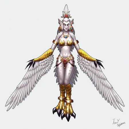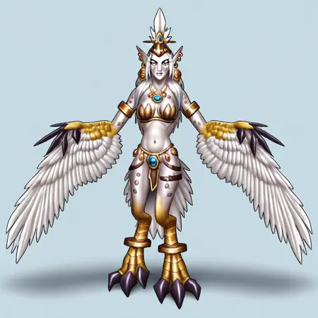 AvianaWoW、1girl、単体、モンスターガール、ハーピー、頭に羽、白い羽、金色の頭飾り、羽のなみだ、白い目、鼻、唇、顔の模様、象牙色の肌、尖った耳、イヤリング、股間と胸だけを覆う金色の衣装、大きな胸、胸元、ビキニ風の金色の鎧、腰布、ジュエリー、サファイアのネックレス、金色の腕輪、翼、へそ、腹部、股間、翼のある腕、爪、鳥の脚、金色の足輪、鳥の尾、鋭い爪のある足