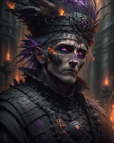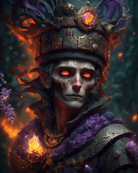 一个超精细的哈迪斯LoRA模型,融合了古老衰败与神圣威严,呈现裸露的骨骼、如余烬般发光的眼睛以及尊贵的冥界服饰。