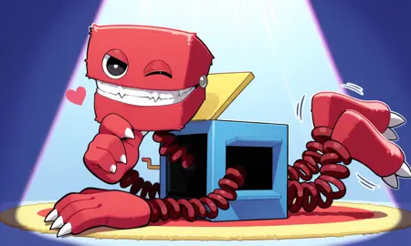 "잭-인-더-박스, 파란색 상자 몸통, 열린 뚜껑, 손잡이, 별(기호), 빨간 코일,"