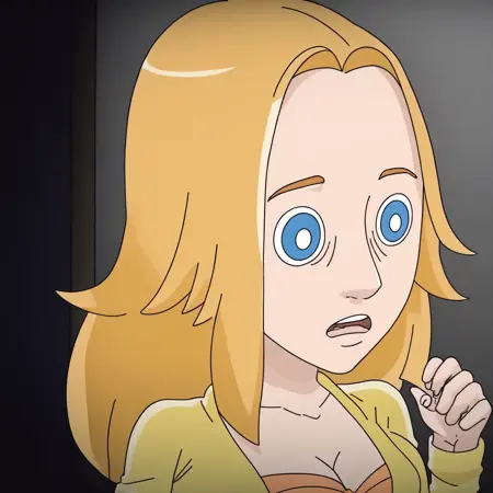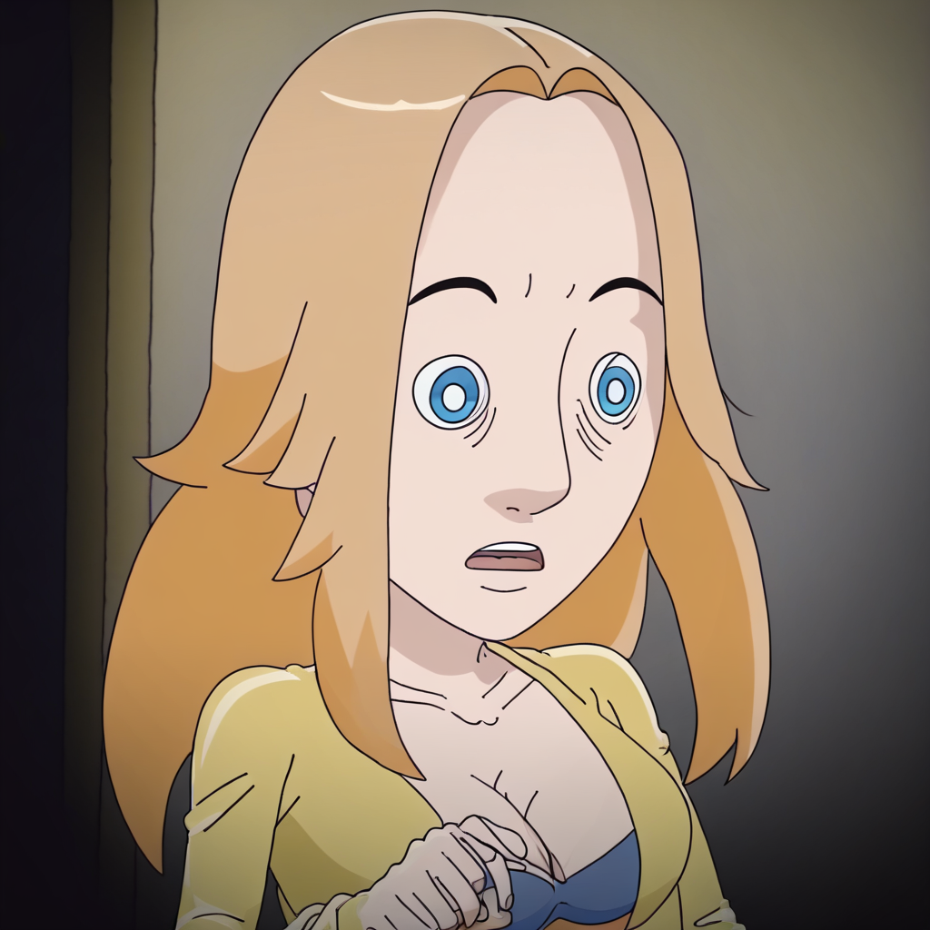 mid long shot, tan, skin complexion, Yellow-orange shirt, clothing, natural hair, blue eyes, bikini, jacket, eyebrow, cleavage,