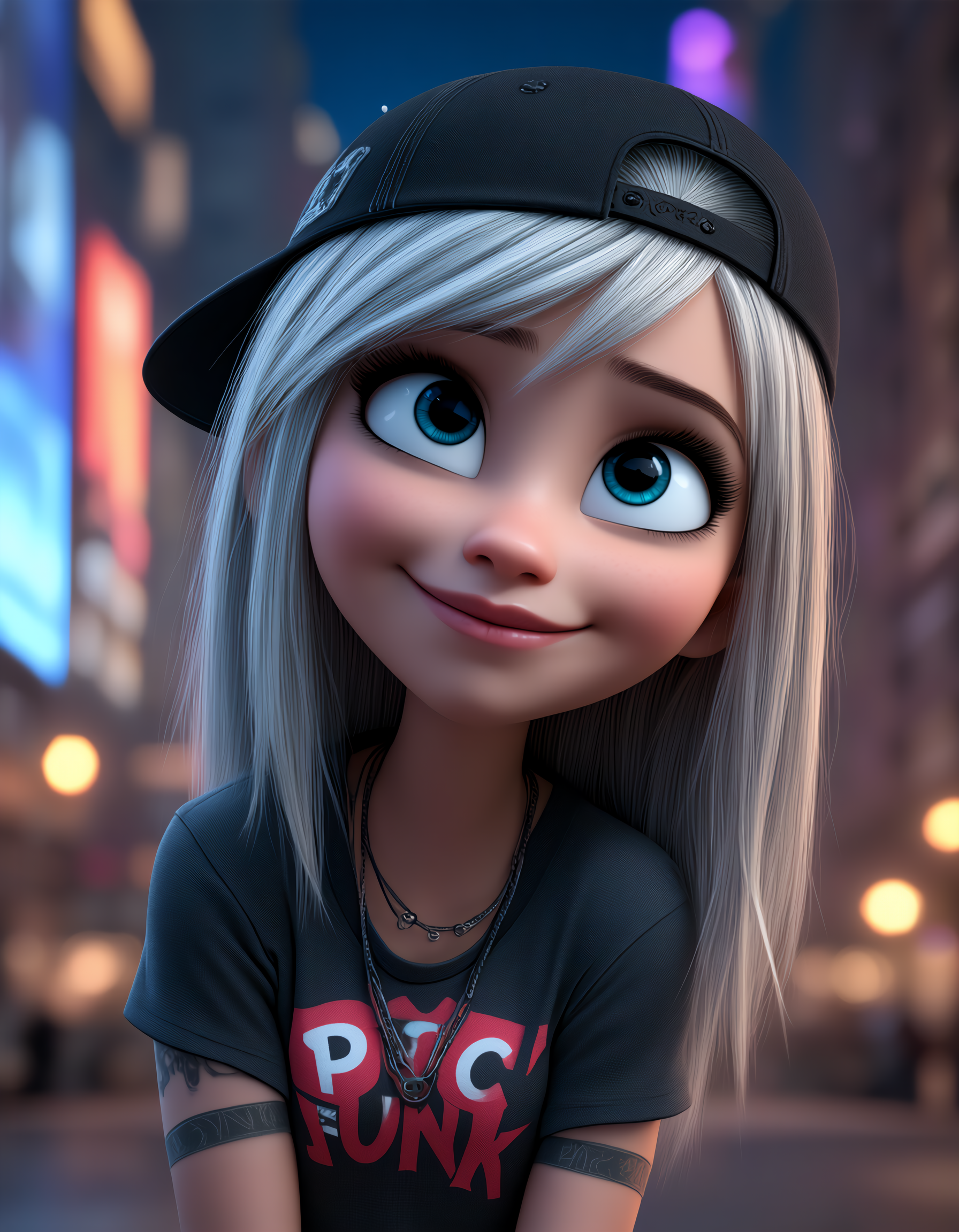극고급 스튜디오 품질의 3D 애니메이션 소녀, 1girl, 펑크 스케이터 소녀 옷차림, 큰 미소, 뒤집어쓴 모자, 매우 긴 은색 머리카락, 최고 품질, score_9_up, score_8_up, 시네마틱한 도시 배경, 화려한 그림자, 생동감, 매우 아름다움, 고해상도, absurdres, 심도의 흐림, 두꺼운 플라스틱 피부, 완벽한 해부학, 매우 awa.