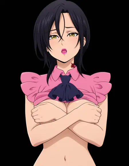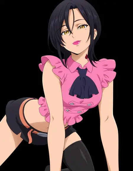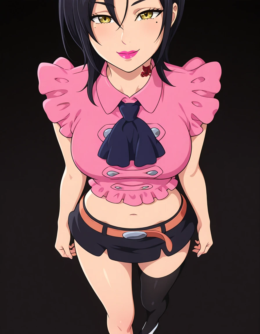 黄色い目、黒髪、中くらいの髪、目の下のほくろ、メイク、口紅、首のタトゥー
