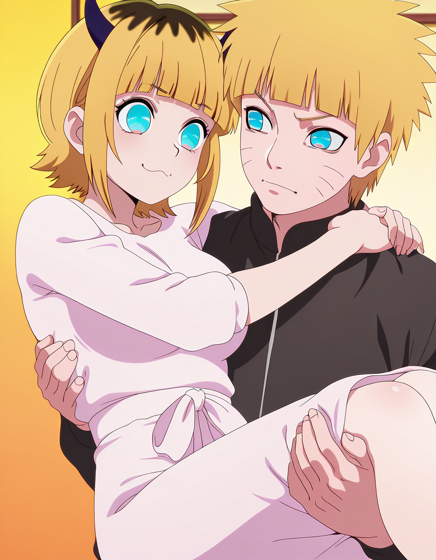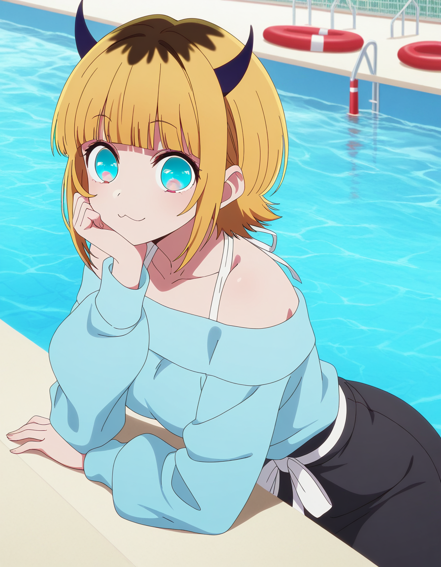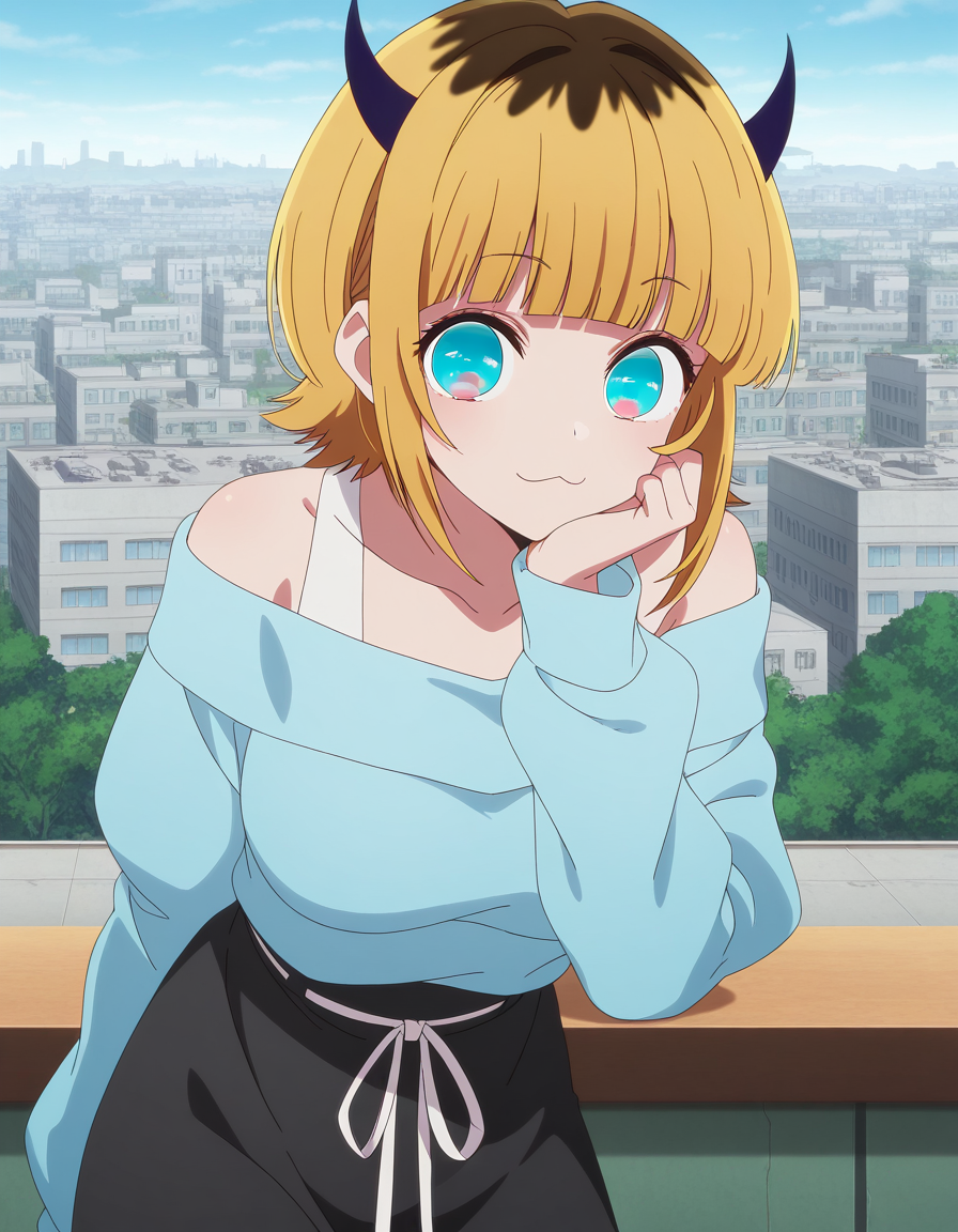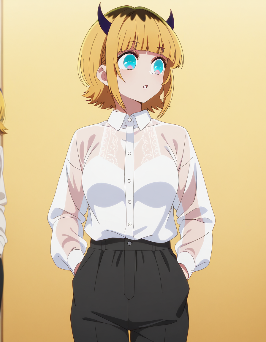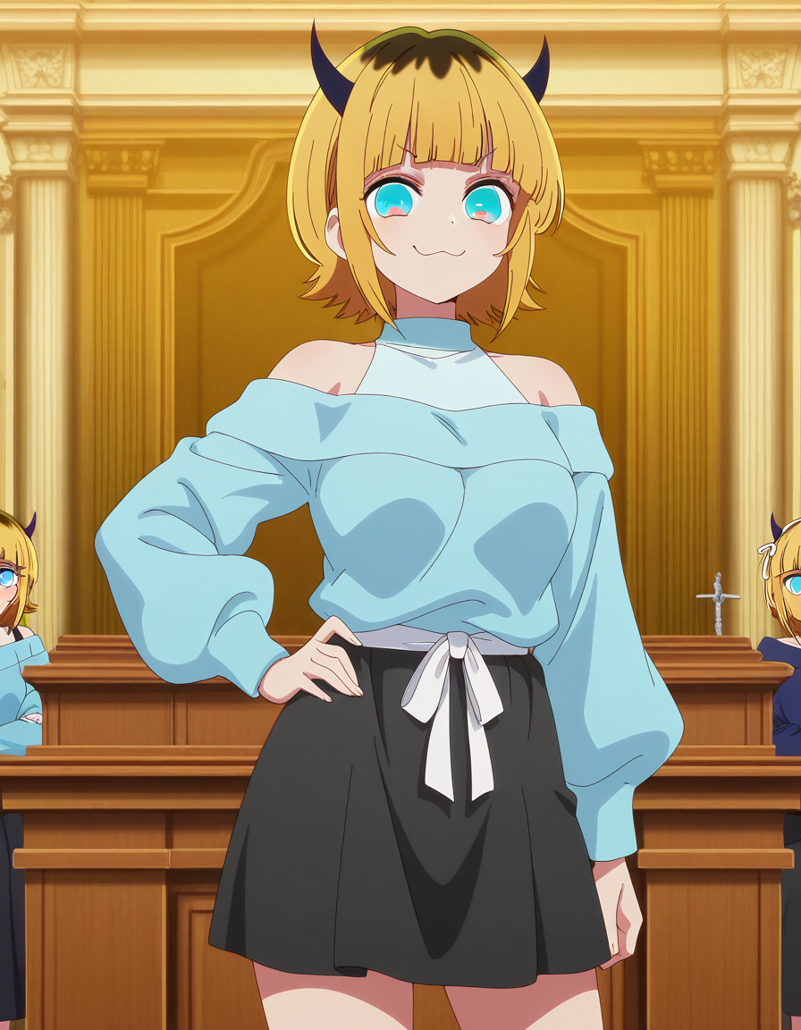 memcho, 금발, 파란 눈, 곧은 앞머리, 악마 뿔, 가짜 뿔, 뿔, 단발, 성숙한 여성, 중간 정도의 가슴, 애니메이션 스크린캡