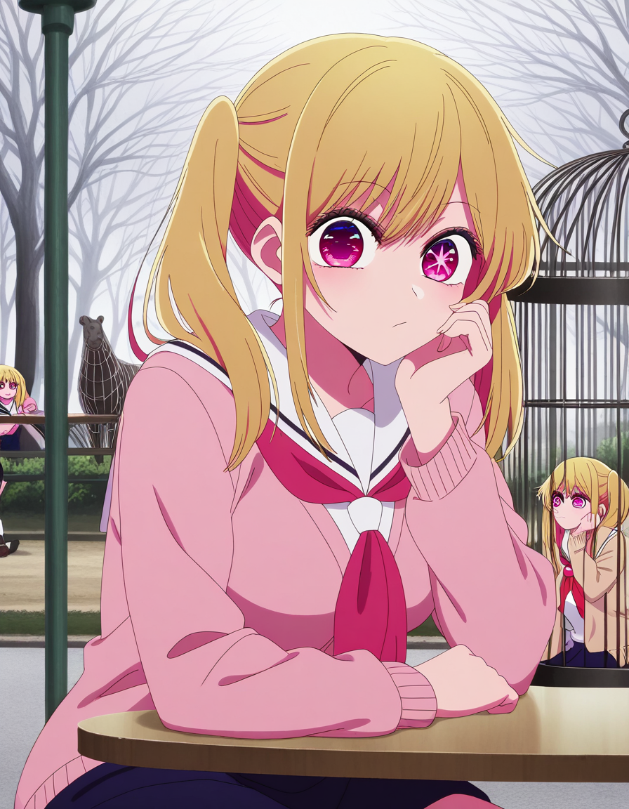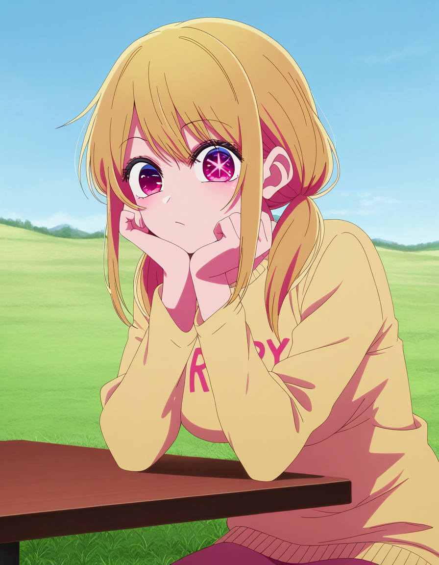 ruby hoshino, hoshino ruby, 긴 머리, 앞머리, 금발, 분홍 눈, 옆머리, 기호 모양의 동공, 다채로운 머리카락, 이색 머리카락, 두 개의 트윈테일, 낮은 트윈테일, 성숙한 여성, 중간 크기 가슴, 애니메이션 스크린캡
