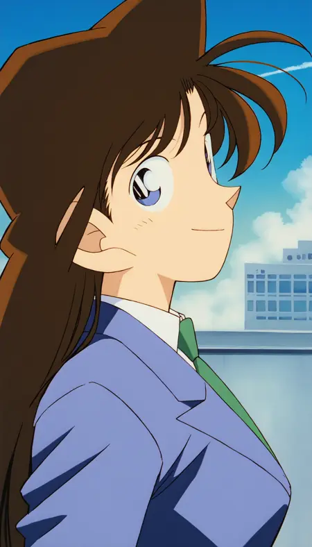 mouriran, 1girl, solo, black hair, long hair, bangs, blue eyes, blue blazer, white shirt, green necktie, blue pleated skirt, white socks, green sneaker,