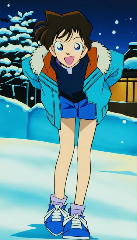 mouriran, 1girl, solo, black hair, long hair, bangs, blue eyes, cyan coat, deep blue pullover, blue shorts, white socks, blue sneakers,