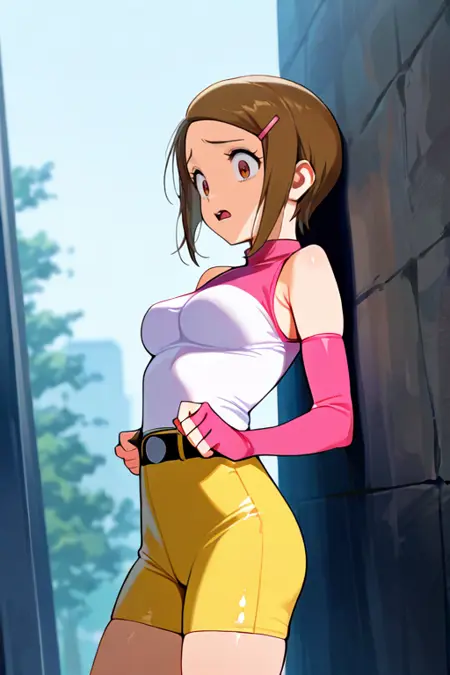 중간 크기 가슴, hikaridef, 소매 없음, 꼭 맞는 옷, 팔꿈치 장갑, 손가락 없는 장갑, 벨트, 노란 반바지, 흰 양말, 신발