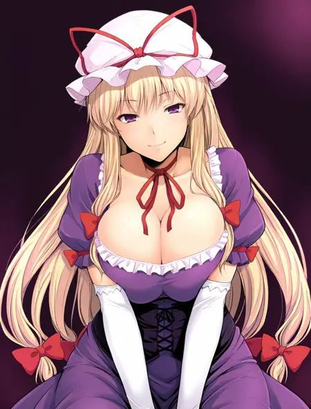 1소녀, 가슴, 단독, 야쿠모 유카리, 금발, 보라색 눈, 긴 머리, 큰 가슴, 관찰자 바라보기, 모자, 드레스, 장갑, 보라색 드레스, 긴 머리, 금발, 리본, 큰 가슴, 가슴 선명함, 팔꿈치 장갑, 짧은 소매, 모자 리본, 활, 빨간 리본, 모자캡, 부푼 짧은 소매, 리본 치커, 카우보이 샷, 미소,