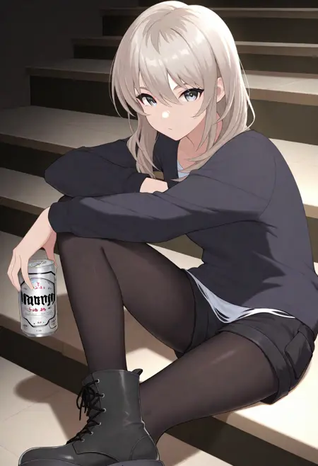 kawaragi momoka, 1girl, solo, pantyhose,sweater, shorts, black sweater, choker, black pantyhose, long hair, blue shorts, black choker, long sleeves, denim shorts, pantyhose under shorts,