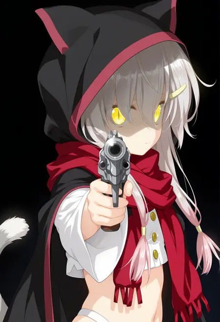 red scarf,white skirt,pleated skirt,single thighhigh,white thighhighs,single sock,frills,uneven legwear,asymmetrical legwear,frilled skirt,midriff,bandaid on leg,single kneehigh,white socks,cat hood,hooded cloak,miniskirt,white shirt,crop top,long sleeves,white sleeves,