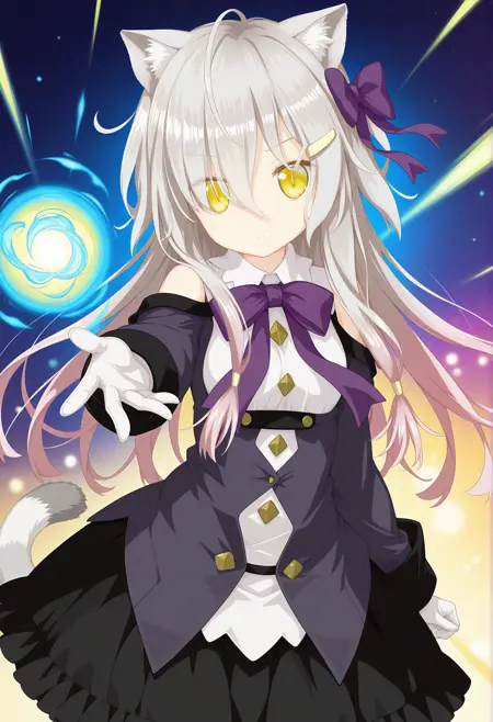 magical girl,hair bow,purple bow,white shirt,long sleeves,sleeveless shirt,black skirt,white gloves,bandaid on knee,frilled skirt,collared shirt,shoulder cutout,purple bowtie,wide sleeves,diamond button,gold buttons,purple sleeves,black sleeve cuffs,purple dress,black trim,circle skirt,short dress,black frills,