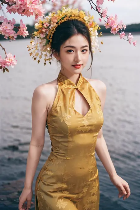 例:1 girl, smile, xunpu, chinese clothes, yellow dress, flower print, hair flower, lake, floral, ((floral background)) < lora:Xunpu_V6:0.8 >