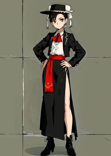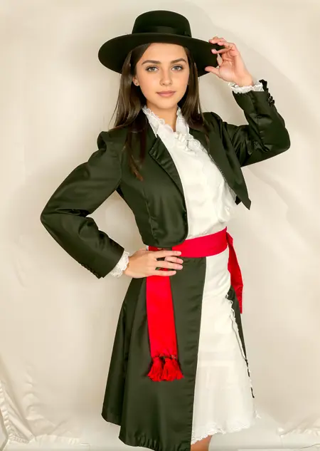 Huasa Formal: lora:HuasaChile\_v1:0.6, HuasaChile, Huasaformal, sash, red sash, black dress, black shoes, hat, sleeves, jacket, white blouse, formal, hand on hip