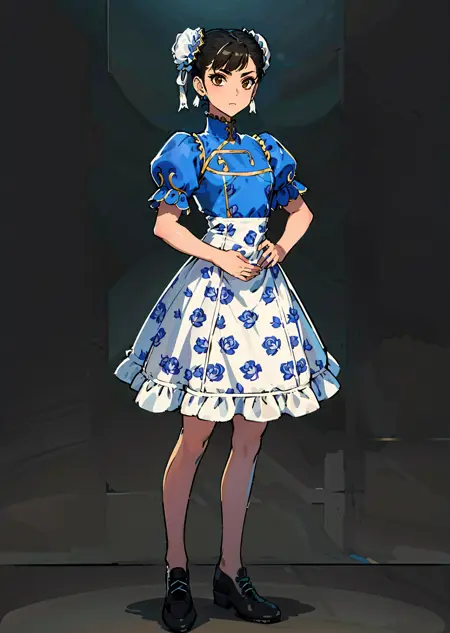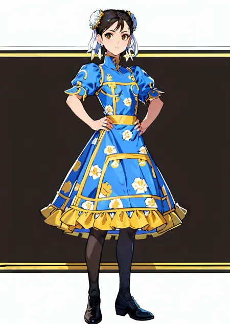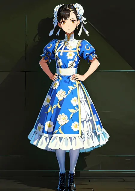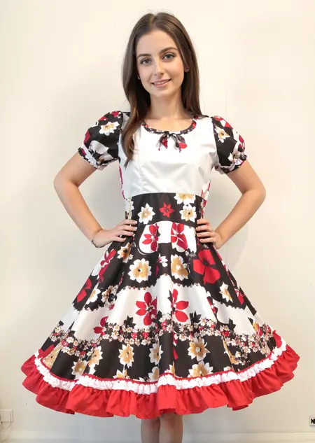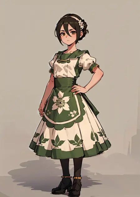 Huasa China: lora:HuasaChile\_v1:0.6, HuasaChile, Huasachina, shash, puffy dress, dress, puffy short sleeves, pantyhose, black footwear, floral print, print dress, hand on hip