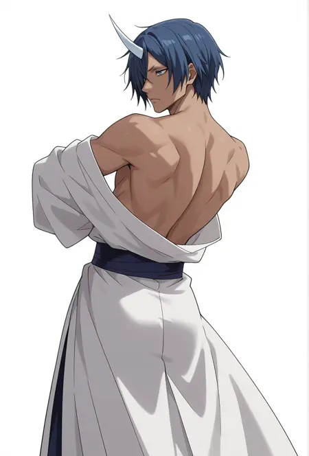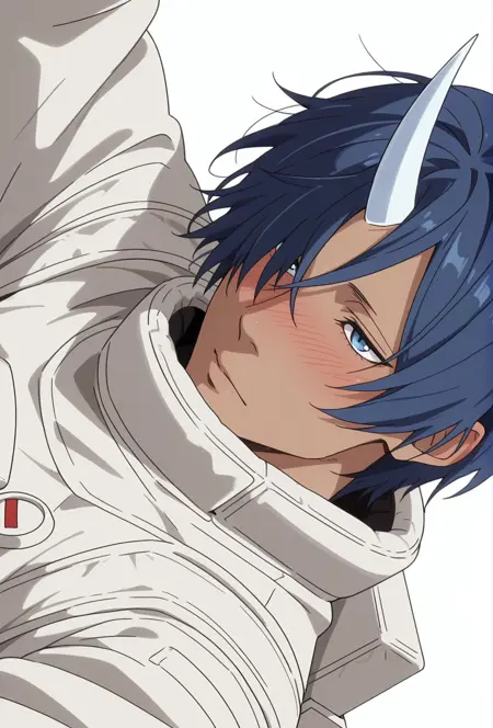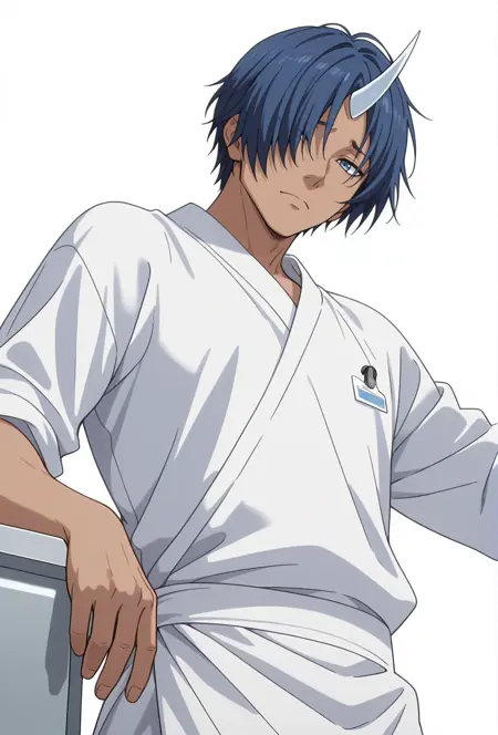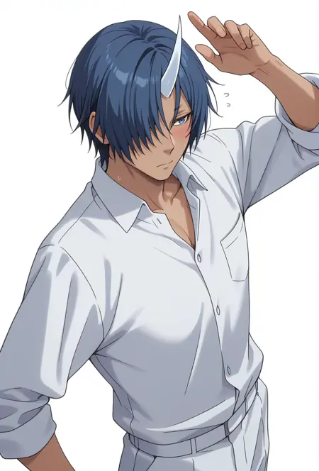 souei_cnr, 1boy, blue eyes, blue hair,dark-skinned male, hair over one eye,short hair, single horn,