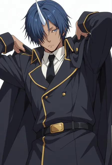 souei_euniform, black jacket, black necktie, cape, coat, collared shirt, jacket, long sleeves, necktie, shirt, uniform, white shirt, belt,