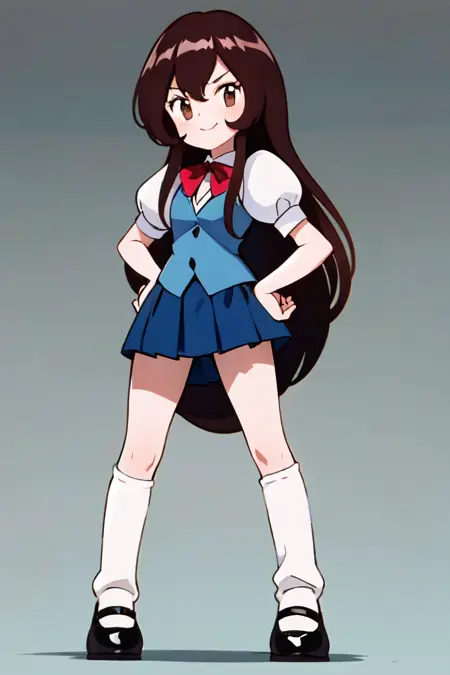 Prompts: 1girl, solo, long hair, looking at viewer, smile, bangs, skirt, brown hair, shirt, brown eyes, school uniform, white shirt, short sleeves, pleated skirt, shoes, socks, puffy sleeves, miniskirt, black footwear, vest, puffy short sleeves, blue skirt, kneehighs, white socks, mary janes, retro artstyle, blue vest