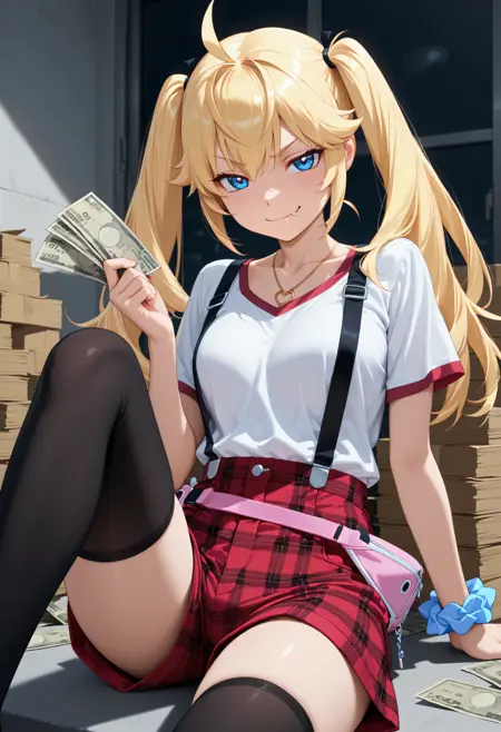 金髪、ツインテール、ヘアタイ、ヘアフラップ、アホ毛、青い目、長い髪、黒いサスペンダー、白いシャツ、赤いトリム、ハートネックレス、ノースリーブ、黒いタイツ、赤いショートパンツ、チェック柄ショートパンツ、ピンクのベルトポーチ、青い手首スクランチ
