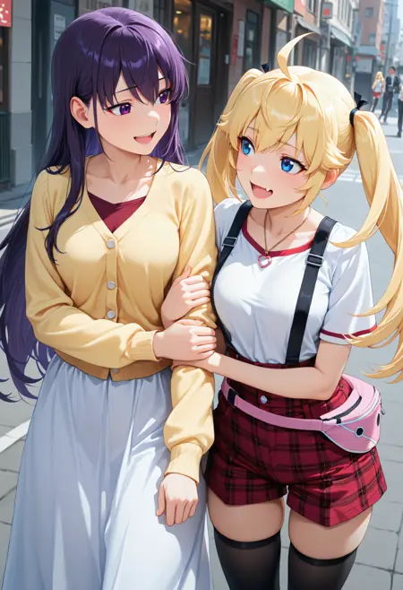金髪、ツインテール、ヘアタイ、ヘアフラップ、アホ毛、青い目、長い髪、黒いサスペンダー、白いシャツ、赤いトリム、ハートネックレス、白いジャケット、フーディー、開いたジャケット、広い袖、赤いショートパンツ、チェック柄ショートパンツ、ピンクのベルトポーチ、青い手首スクランチ