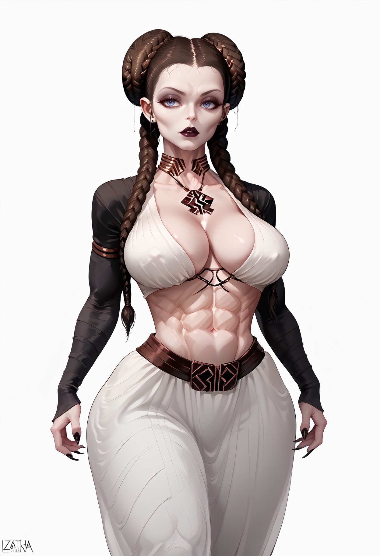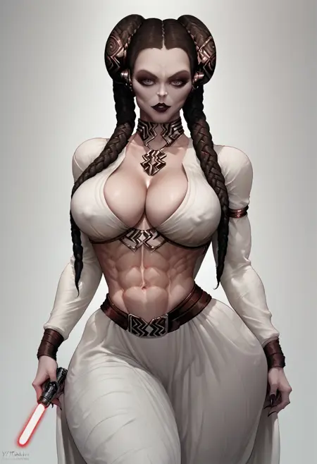 Main trigger is sith_leia and other triggers that help are abs, cleavage and braided ponytail. Holding a lightsaber adds a lightdagger in PONY.
