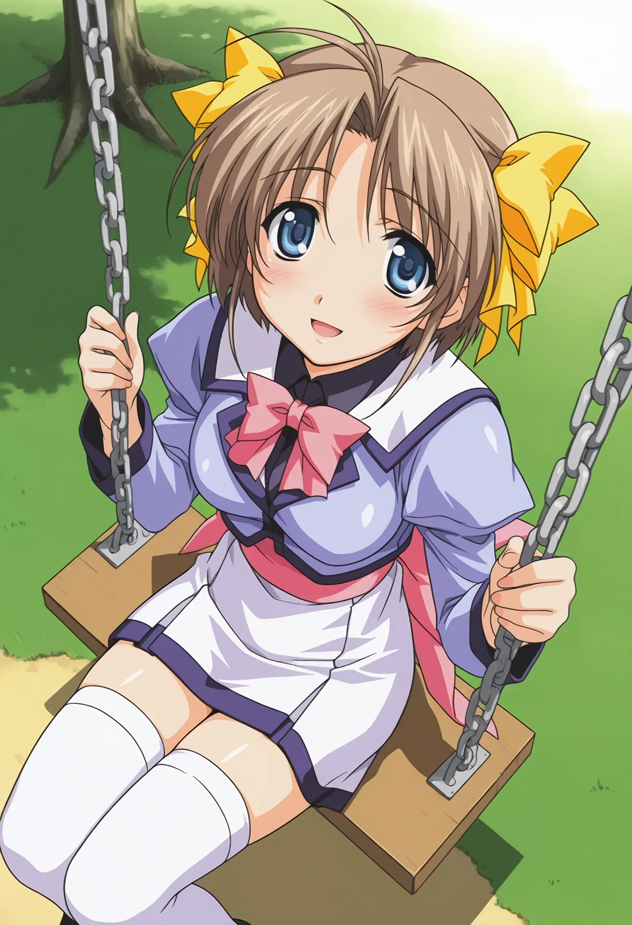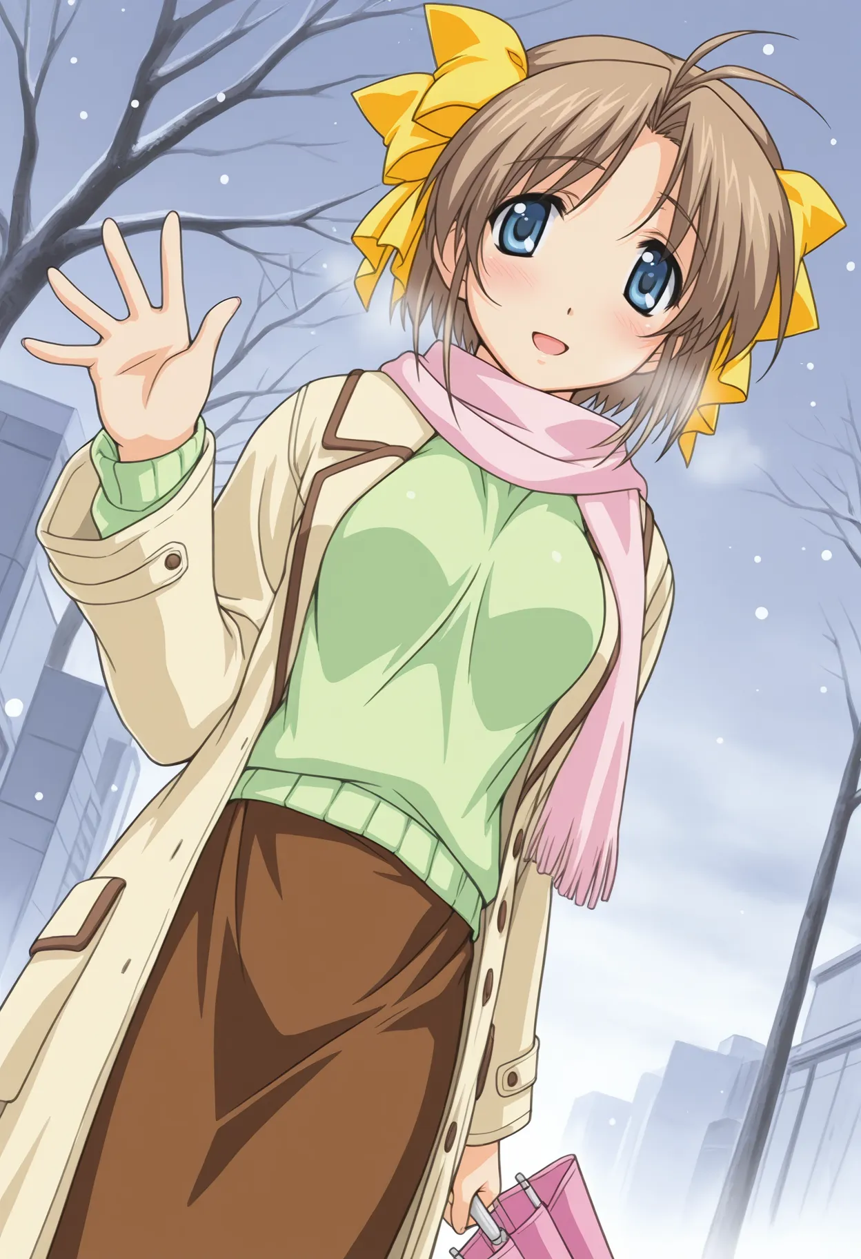 외모: MizuiroYuki, 갈색 머리, 단발, 안테나 머리, 앞머리, 노란색 머리리본, 타레메, 파란 눈, 중간 크기 가슴,