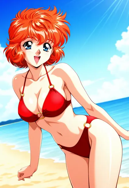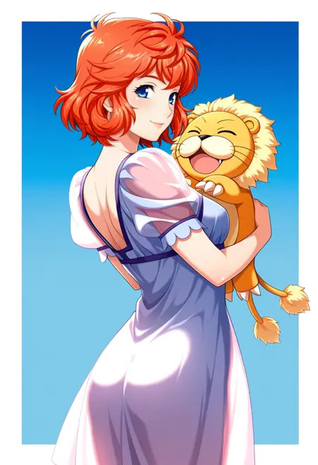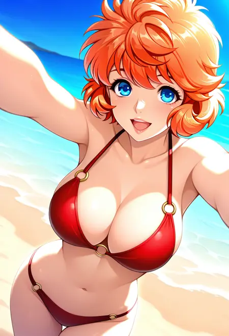 srw_lefina, 1girl, solo, red hair, orange hair, fluffy hair, short hair, blue eyes, lips
