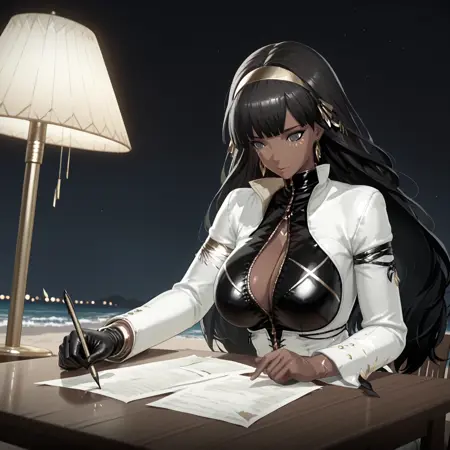 기본 복장(언더사이징 버전): 터틀넥, 흰색 옷, 가슴선, 큰 가슴, 검은 장갑, 허벅지 부츠,