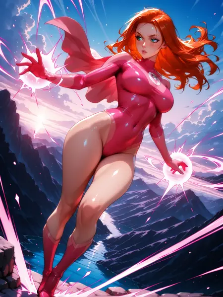 服装提示词:紧身衣,超级英雄,紧身连体衣,粉色紧身衣,斗篷,粉色手套,及膝靴,粉色鞋履,遮住肚脐,贴身,短裤