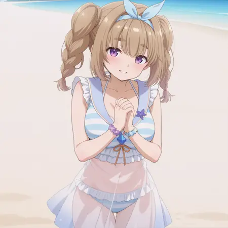 外見: 紫色の目、濃い眉、薄茶色の髪、中くらいの長さの髪、編み込みツインテール、髪の流れ、小柄、中くらいの胸、リボンヘアバンド、oppai l*li