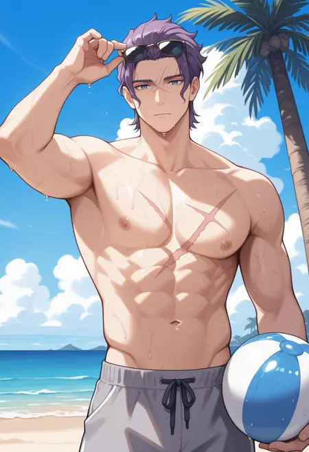 외모: 얼굴의 흉터, 십자 흉터, 단발, 보라색 머리, 뒤로 빗어올린 머리, 파란 눈