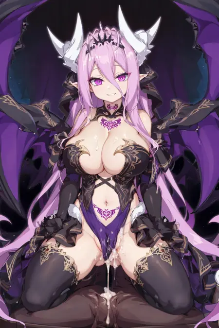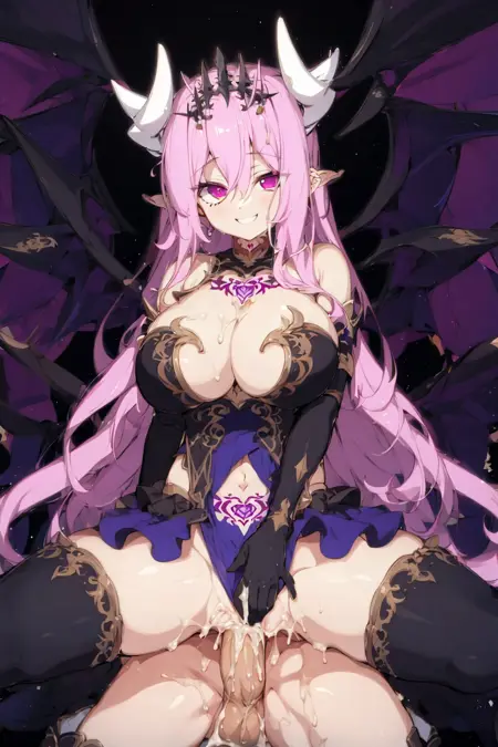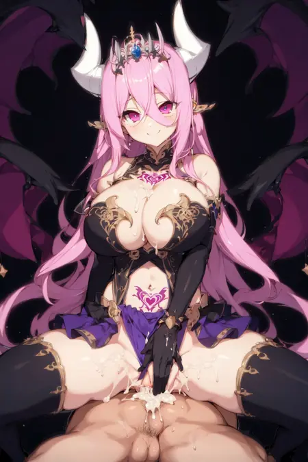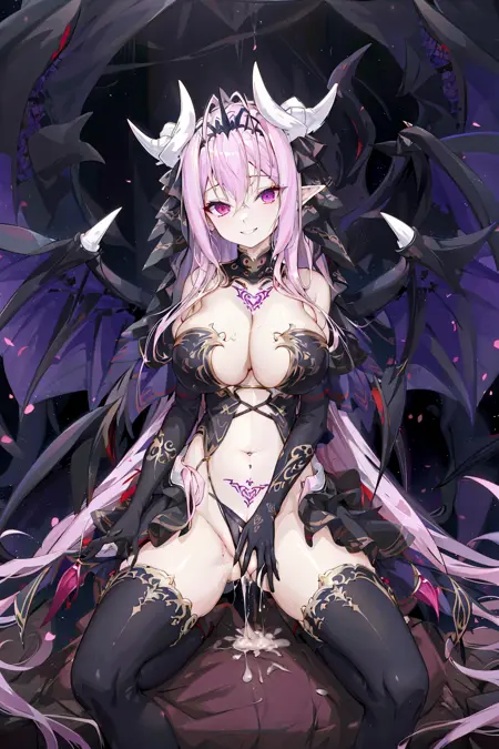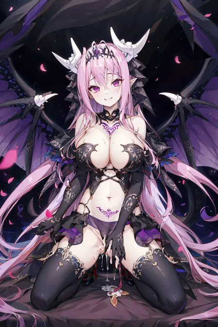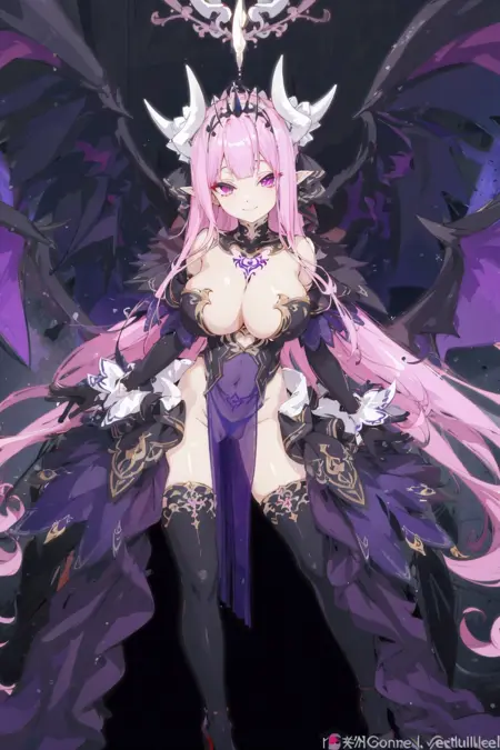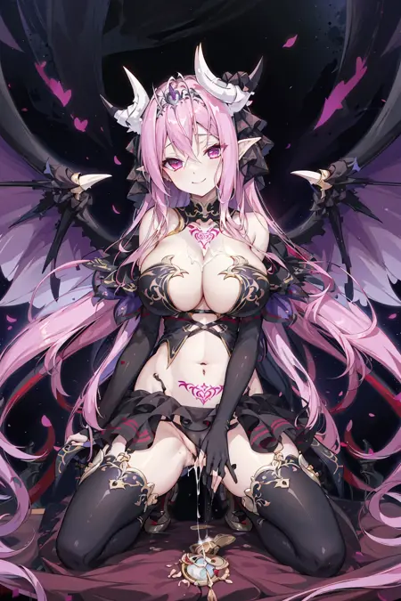 LuxielLeaderThree, LuxielLeaderThree horns, LuxielLeaderThree diadem, LuxielLeaderThree wings, LuxielLeaderThree tail, LuxielLeaderThree neck tattoo, LuxielLeaderThree breast tattoo, chest tattoo, LuxielLeaderThree pubic tattoo, stomach tattoo, LuxielLeaderThree pelvic curtain, see-through, LuxielLeaderThree skirt, 1girl, solo, huge breasts, cleavage, very long hair, pink hair, looking at viewer, hair between eyes, smile, bare shoulders, pink eyes, purple eyes, red eyes, high heels, black thighhighs, elbow gloves,