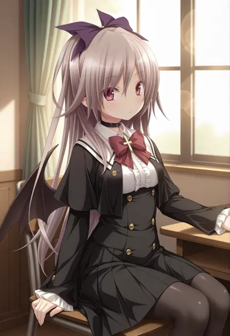 school uniform,black dress,center frills,cross brooch,red bowtie,gold buttons,long sleeves,frilled sleeves,white frills,black capelet,white sailor collar,white shirt,collared shirt,black pantyhose,