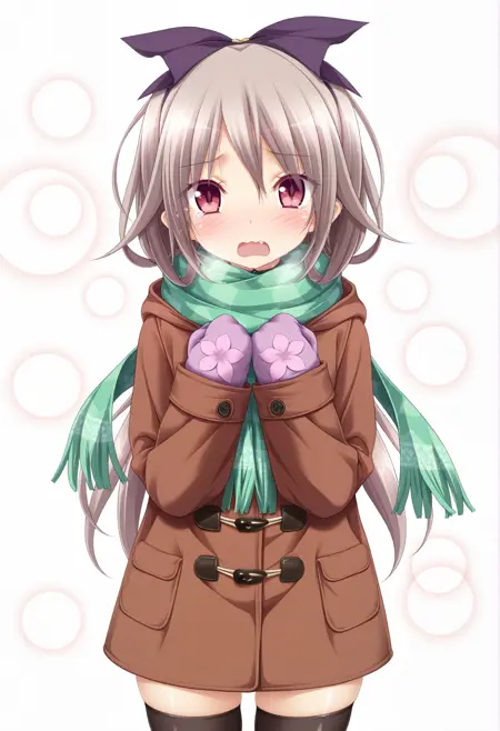mittens,duffel coat,winter clothes,ponytail,brown coat,green scarf,black thighhighs,