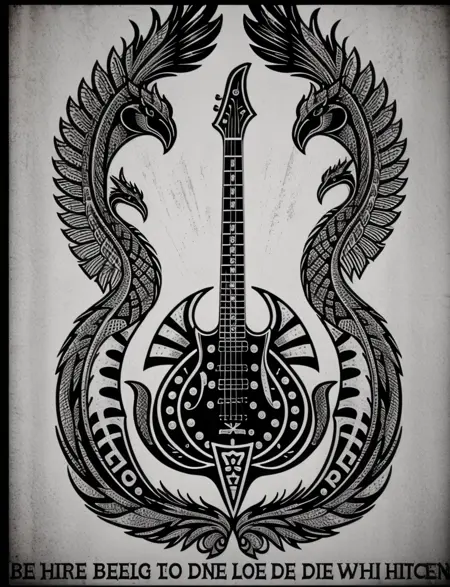 (((poster))), bird, guitar background, big dragon, fire <lora:VintageRock:1>