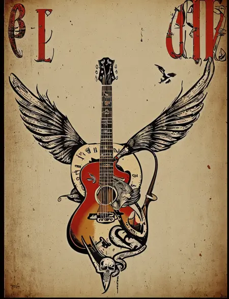 vintage, bird, skull (((poster))), backround guitar, <lora:VintageRock:1>, big wings