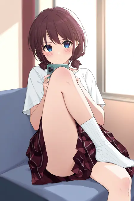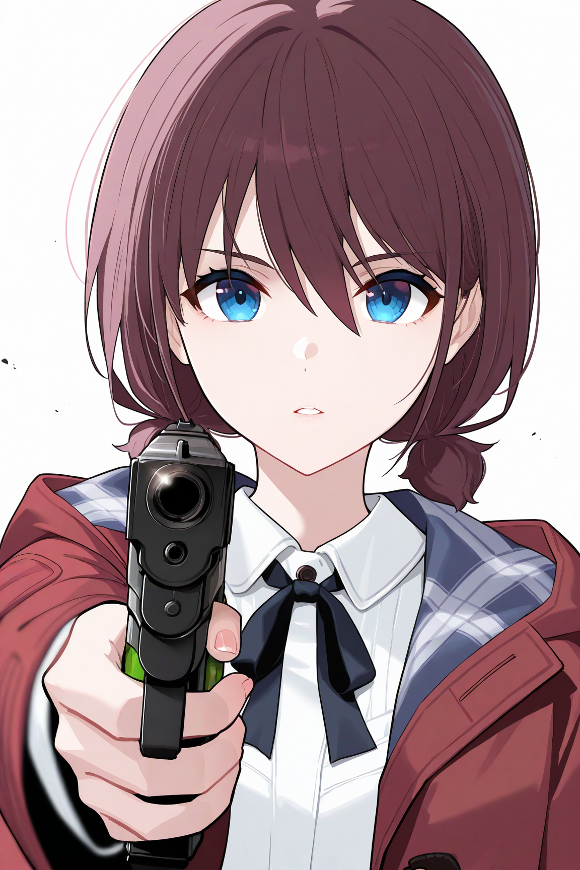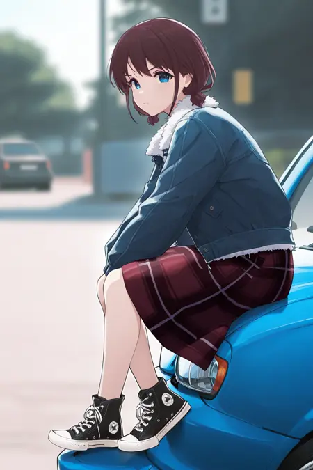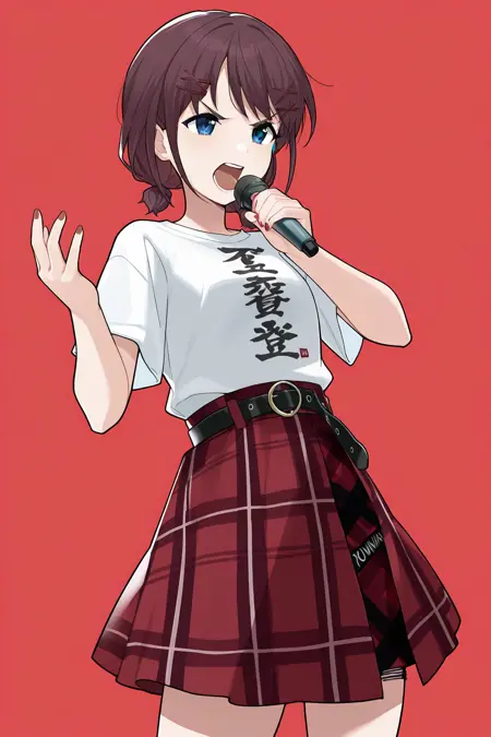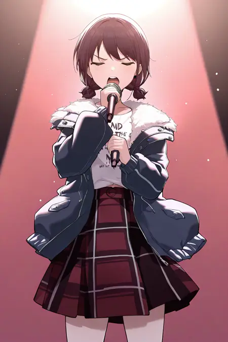 iseri nina,1girl,twintails,jacket,plaid,shirt,clothes writing,skirt,plaid skirt,