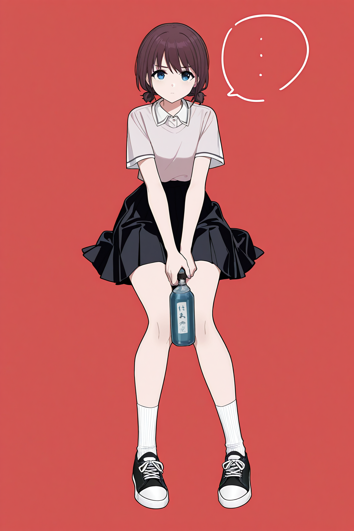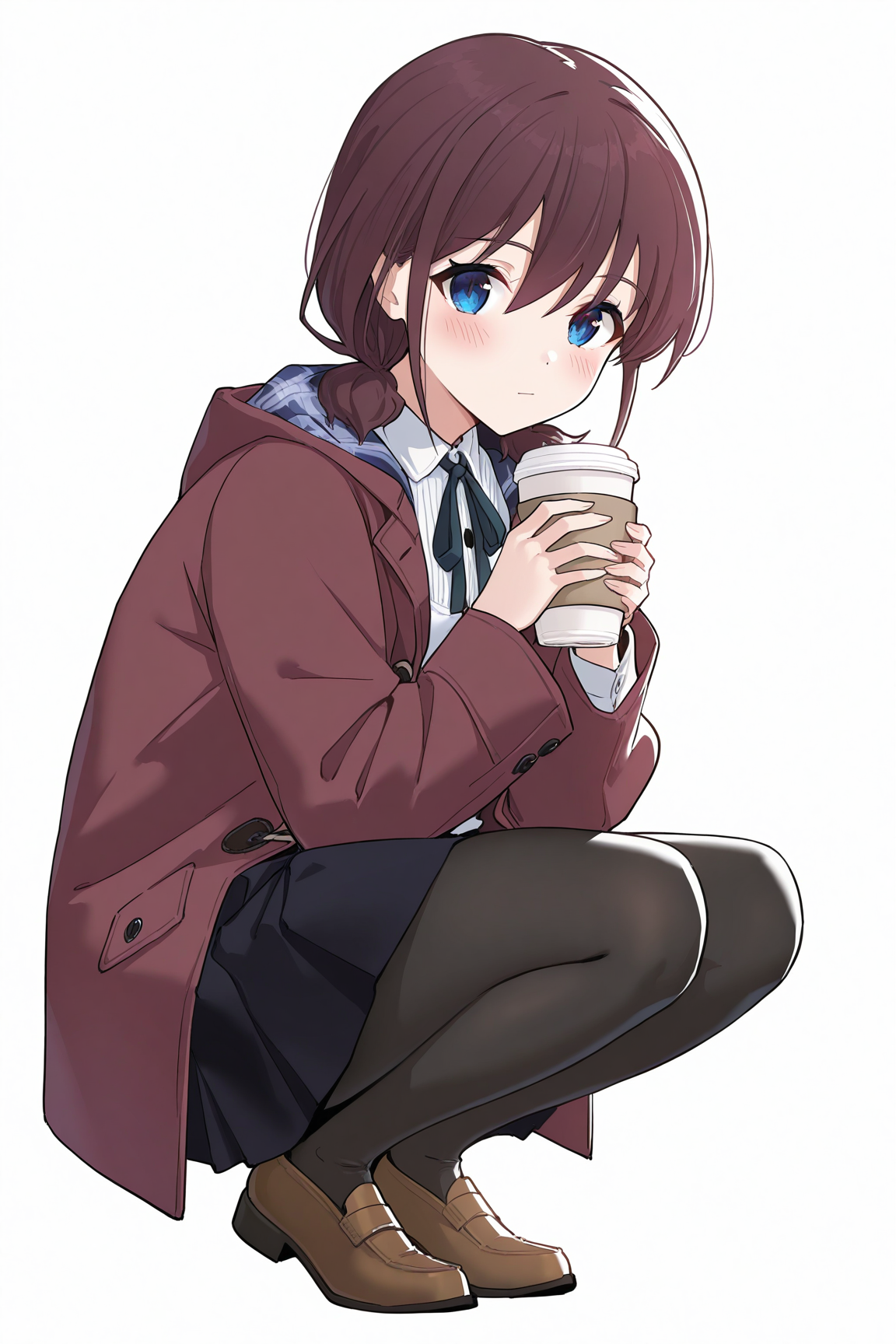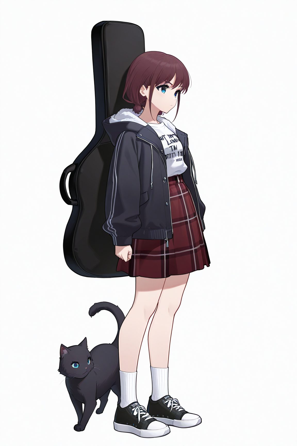iseri nina,1girl,skirt,cat,jacket,socks,shoes,shirt,solo,white socks,black cat,plaid,white shirt,black footwear,plaid skirt,black jacket,sneakers,clothes writing,hood,open clothes,open jacket,long sleeves,hooded jacket,