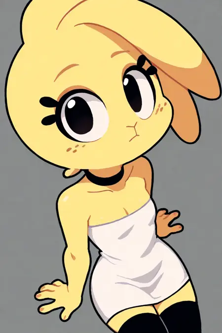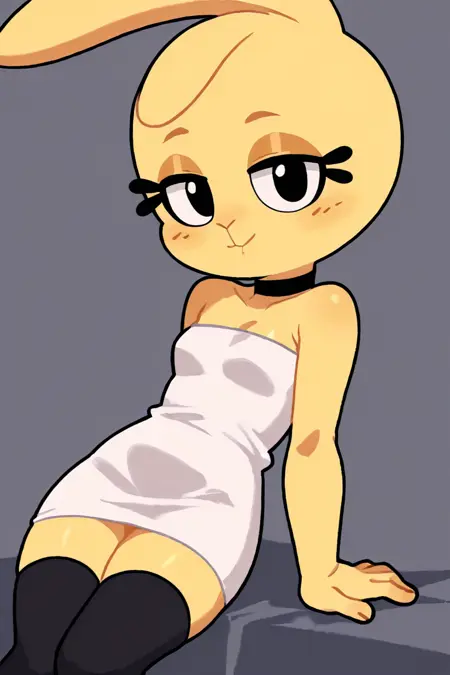 gtbonita, 兔女孩, 1girl, 黄色皮肤, 黑色项圈, 短裙, 白色连衣裙, 裸露双臂, 黑色过膝袜,