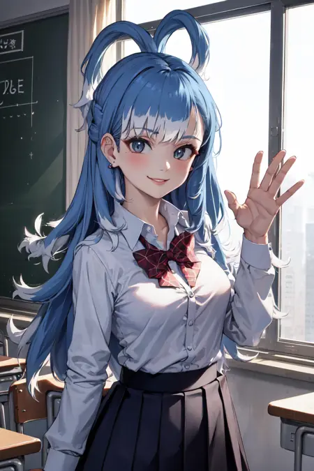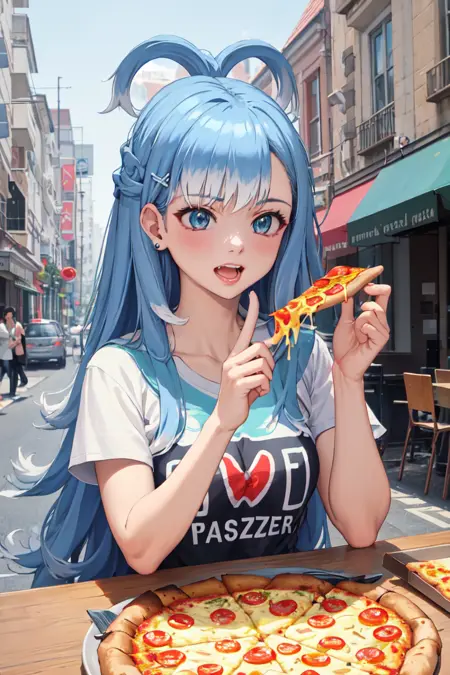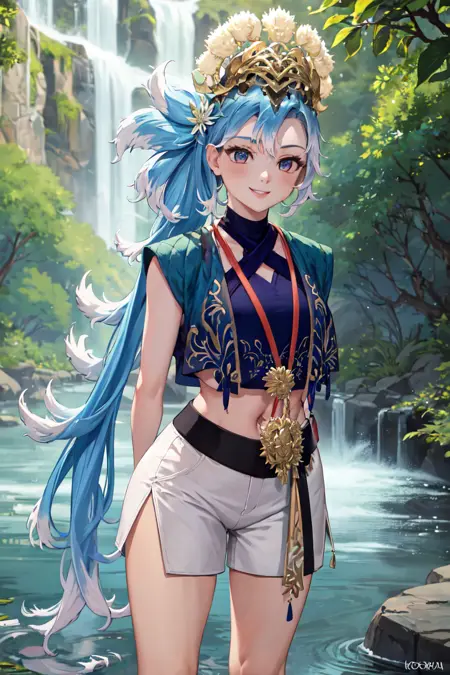"Kobo3rd, 侧边马尾, 手镯, 发饰, 蓝色上衣, 无袖, 露脐, 白色短裤"